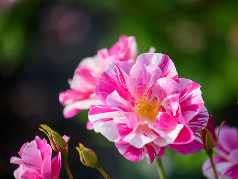 The distinctive fuchsia and white striped petals give this plant a bold yet natural appearance, reminiscent of classic Gallica roses. Its semi-double blooms appear abundantly, drawing pollinators to the vibrant yellow stamens at the centre. The light-to-medium musk fragrance carries subtle fresh red apple and rosewater notes. This versatile and robust shrub has a vase-shaped growth habit and heart-shaped leaves.