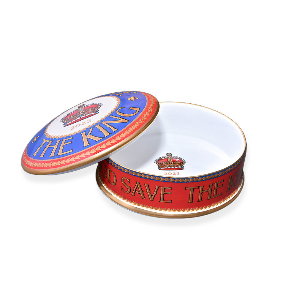 Store all your essential trinkets in this beautifully delicate round trinket box. It forms part of the esteemed Duchess China's exclusive range of commemorative "God Save The King" fine bona china, celebrating the Coronation of His Majesty The King Charles III.