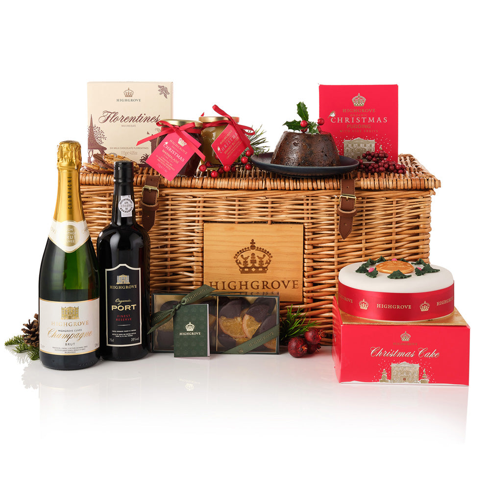*The image of our hamper illustrates sample contents only. Contents may vary depending on product availability. Occasionally, we may need to substitute items in the hamper; these will be of equal or greater value. Hampers may come in feathers or crown plaque.
