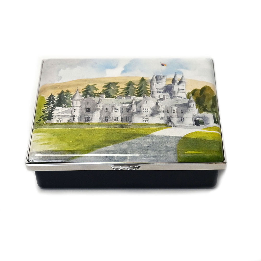 This handmade enamel box features a reproduction of a watercolour by His Majesty King Charles III, created when he was HRH The Prince of Wales in 1989. The painting captures the majestic landscape of Balmoral Castle, the Highland home of the Royal Family, during the height of summer.