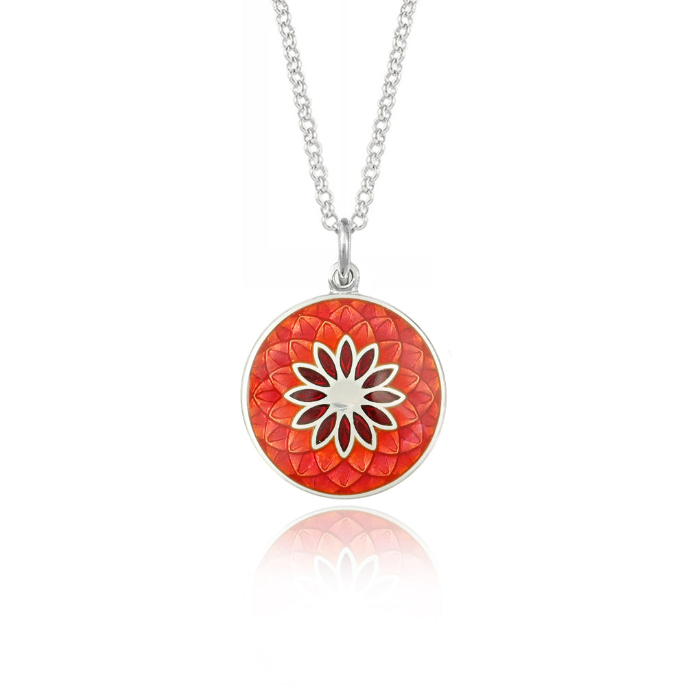 Each pendant is handcrafted using the traditional technique of vitreous enamelling, in which thin layers of glass are fused at high temperatures onto the surface of the metal to create a one-of-a-kind piece. The Dahlia design is based on the flower's geometric 'Fibonacci' sequence. The design is engraved beneath the enamel using the basse-taille technique to achieve different colour depths.