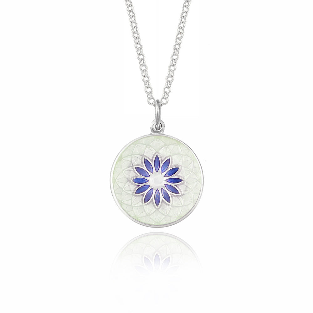 Exclusive to Highgrove, this stunning hand-enamelled sterling silver pendant features an intricate dahlia design with white and blue engravings—a symbol of a lasting bond and commitment. It is a stunning statement piece inspired by the dahlias found in terracotta pots throughout Highgrove Gardens, and it serves as a reminder of the gardens' vibrant colour.