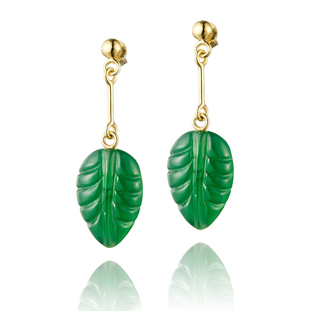 These earrings are a part of the Tahima jewellery collection, which takes its name from a princess in the epic Shahnameh poem and celebrates Afghan heritage and culture. The earrings feature a delicate, bold green onyx leaf inspired by the ornamentation found in the Noh Gunbad mosque in Afghanistan. The design echoes the hand-carved stucco that decorates the mosque's columns and archways, while the semi-precious green onyx stone reflects the colours used in the mosque's decoration.