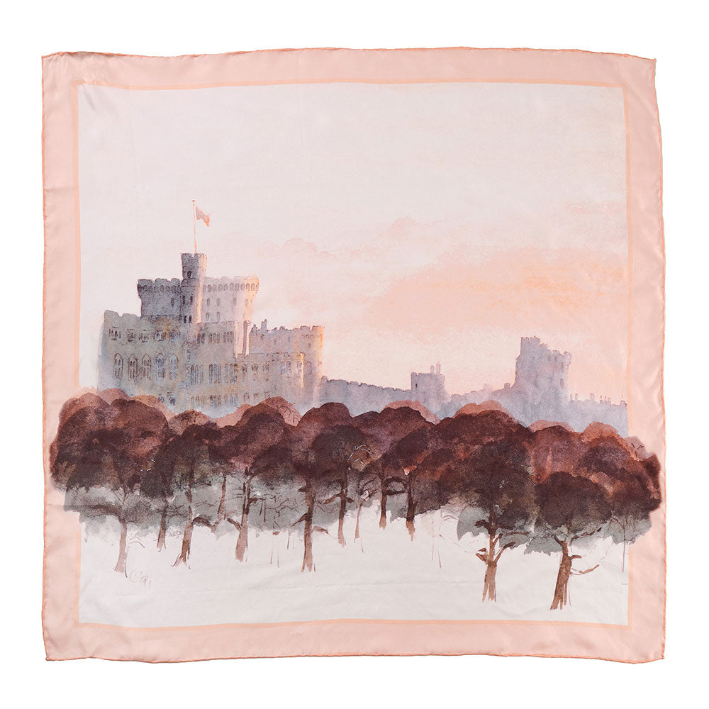 Presenting this opulent silk scarf featuring the captivating North Aspect of Windsor Castle. This distinguished English royal residence encompasses two building complexes, or courts, elegantly divided by a circular tower. Within these courts lie enchanting chapels and regal apartments, showcasing the grandeur of Windsor Castle's North Aspect.