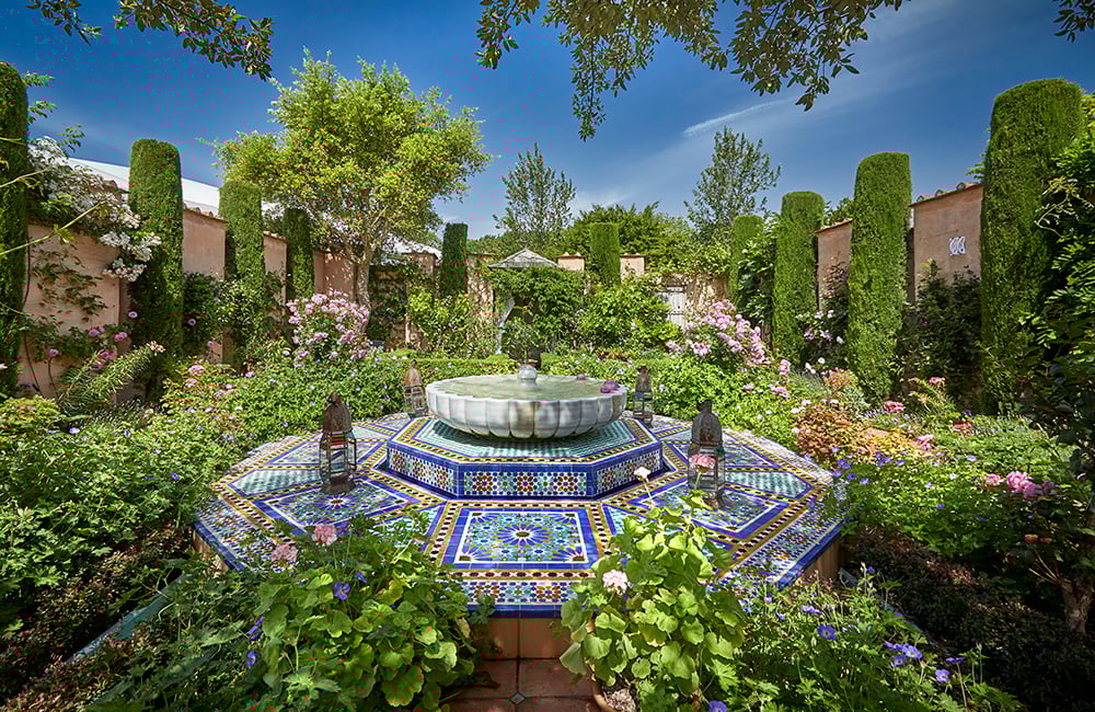 A glorious scheme inspired by the colours of Tibet meets a more traditional English style in this idyllic garden, planted with a mixture of trees, shrubs, and herbaceous plants. Featuring spring and autumn-flowering bulbs, the Cottage Garden delights throughout the year and houses a charming oak summer house, co-designed by HM The King Charles III.