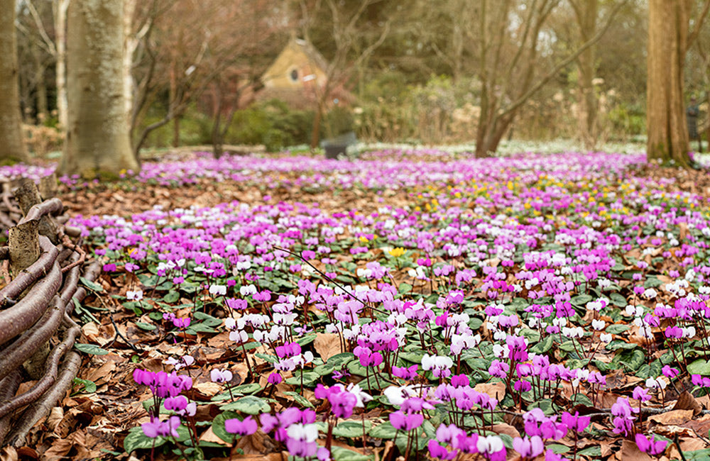 During winter and spring the woodland comes alive with bulbs, including 40,000 snowdrops which were planted to celebrate the 40th anniversary of The Prince’s Trust. Other bulbs include pink and purple cyclamen coum, sapphire-coloured scillas, and beautifully-scented narcissi.