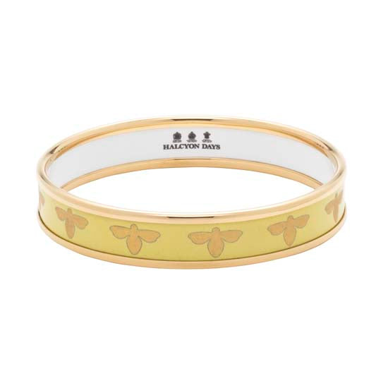 This lovely gold and buttercup yellow bangle pays tribute to one of nature's most precious creatures. This chic enamel bangle is handcrafted in England by Royal Warrant Holders Halcyon Days and features a gold honeybee silhouette against a subtle yellow background. This bangle is finished with 18ct gold-plated raised rims and comes in a gift box and velvet pouch, making it the ideal gift for bee and jewellery lovers alike.