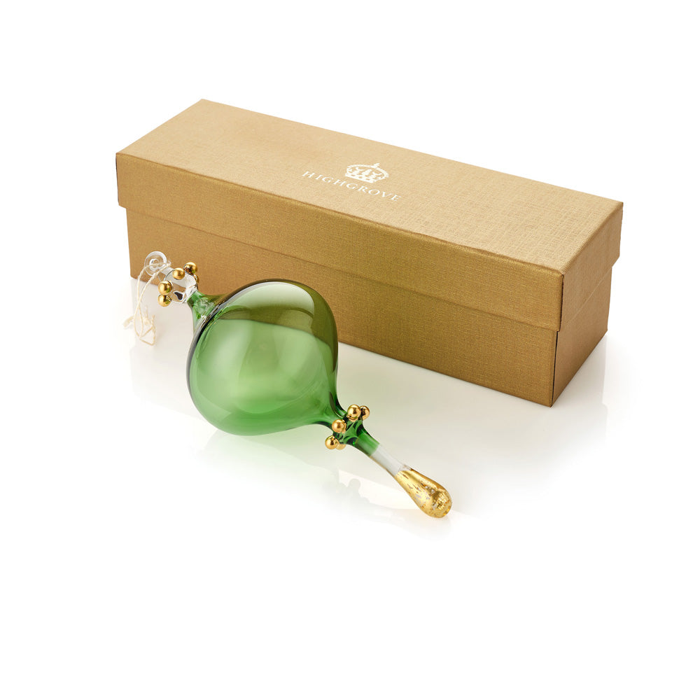 This Classic Shape Green Decoration was commissioned by Highgrove Gardens for 2024 as part of a series of exclusive hand-blown glass decorations. These ornaments are designed to add a touch of luxury and festive cheer to homes and embody the classic elegance of traditional blown glass Christmas decorations. A particular highlight is the gold acorn design, inspired by the beloved gardens of King Charles III and Queen Camilla. This design symbolises growth and potential, making it a fitting choice for the new year.